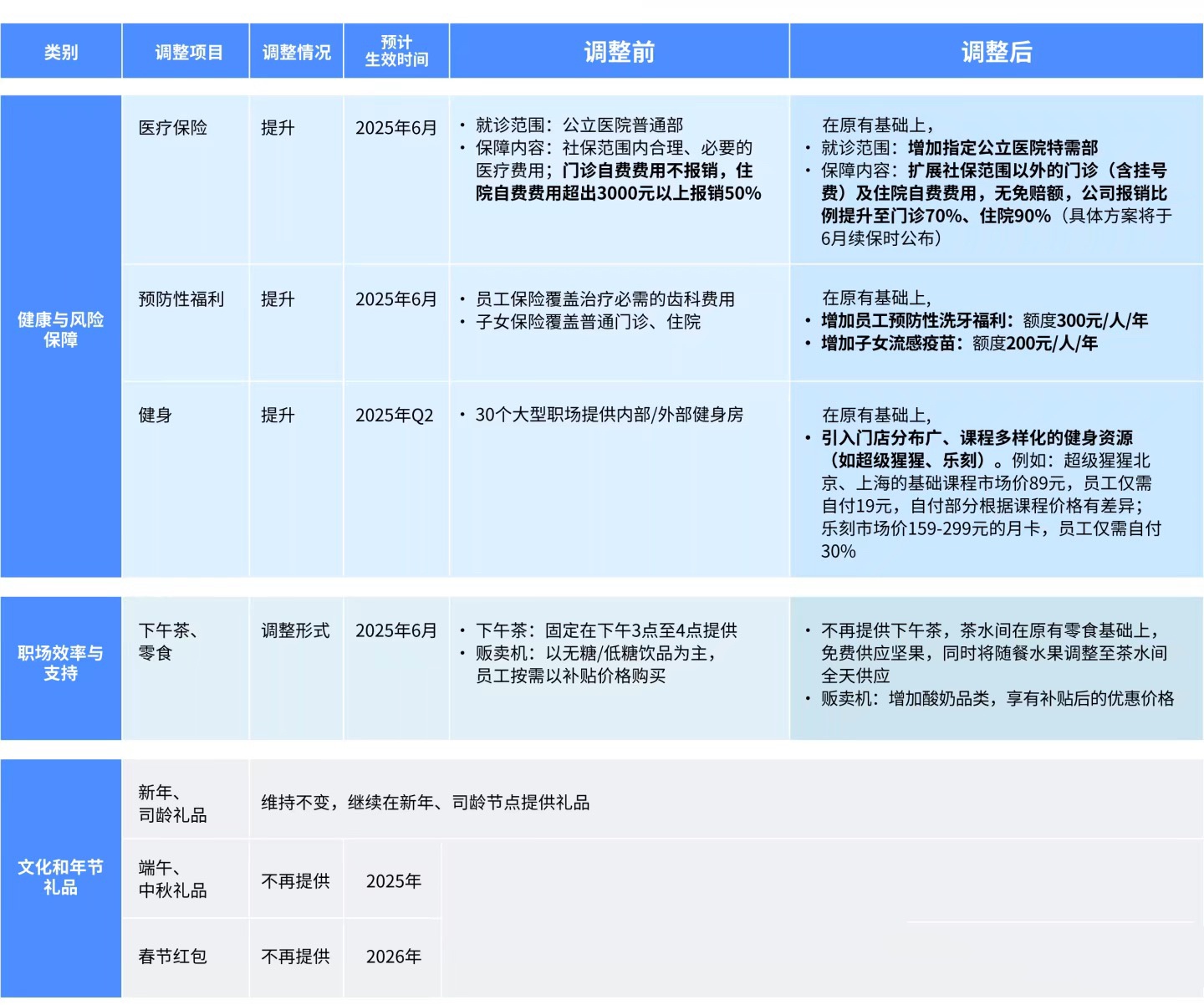 该内部邮件还称,基于务实、简单的福利理念,对员工福利政策进行了一系列调整。其中,员工商业保险将新增覆盖指定公立医院特需部、洗牙和子女流感疫苗,并提高自费报销比例;引入超级猩猩、乐刻等外部健身房,公司为员工覆盖大部分费用。